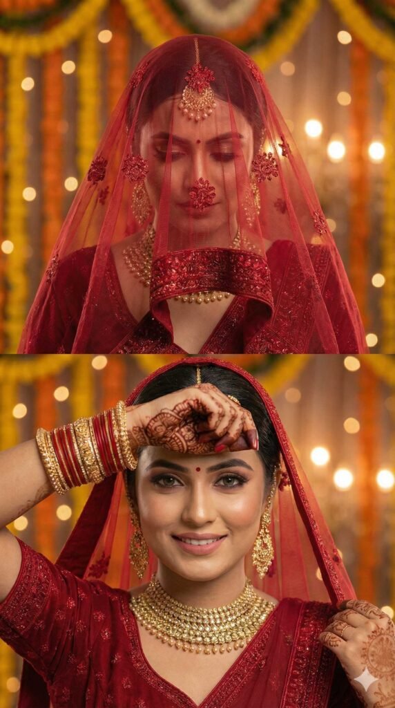 Create ultra photorealistic closeup portrait of an indian bride(the reference image uploaded)wearing red bridal lehenga,Her face is fully covered with a sheer red dupatta(veil), subtly revealing her face from the veil. The veil is fully spread upto neck.Blurry, warm, and festive background of an Indian wedding venue(bookeh effect). Soft, professional studio lighting, Professional photography.100%unchanged face no alteration. 2.Create ultra photorealistic closeup portait of an indian bride(the reference image uploaded)wearing red bridal lehenga, Dupatta placed on her head with an elegant, serene smile.Eyes are looking towards viewers.wearing bridal makeup, heavy jwellery. Her one hand is extended to upside resting her wrist at her forehead and another hand placed near her shoulder.Blurry, warm, and festive background of an Indian wedding venue(bookeh effect).Soft, professional studio lighting Professional wedding shot.