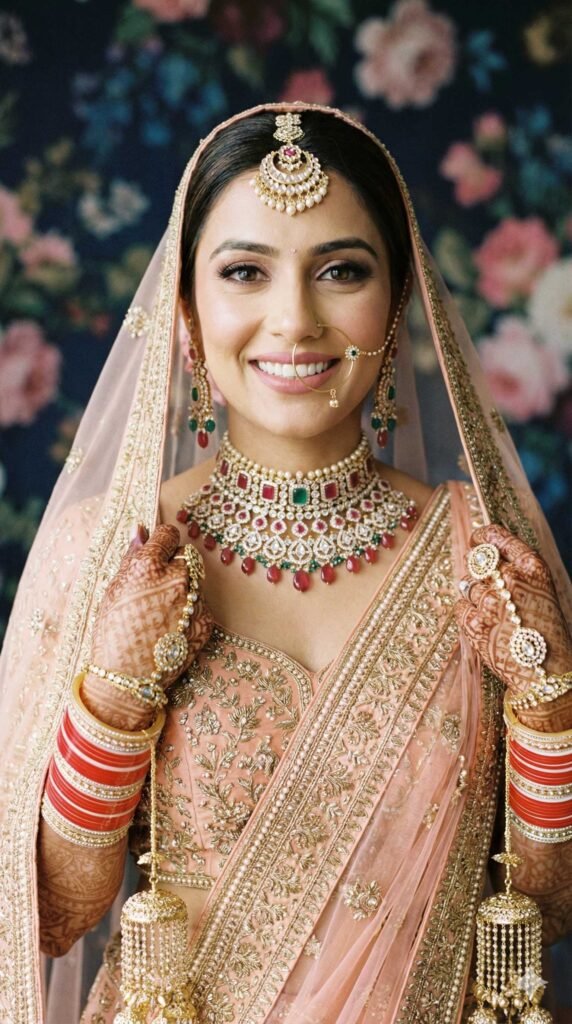 A close-up portrait of a beautiful Indian bride, smiling radiantly and looking directly at the camera. She is adorned in an exquisite light pink or peach bridal lehenga choli with intricate embroidery and delicate beadwork. Her head is gracefully covered with a sheer, embellished dupatta. She wears elaborate bridal jewelry, including a sparkling maang tikka on her forehead, a heavy choker necklace with red and white stones, large dangling earrings, and a traditional nose ring (nath) with a decorative chain. Her hands are decorated with rich henna (mehndi) designs, and she wears a stack of traditional red and white bangles (chura) on her wrists, along with ornate finger rings and a kalire (hanging ornament) attached to one bangle. Her makeup is elegant, featuring defined eyes and soft lip color. The background is a softly blurred, rich floral pattern in dark blue, pink, and green hues, providing a vibrant yet complementary backdrop. The lighting is soft and flattering, emphasizing her joyful expression and the intricate details of her bridal attire and jewelry.