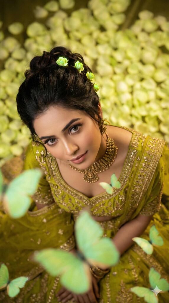 Ultra Realistic Close Top Angle Portrait Of Only Girl In mango green color styliz embroidered lehenga In Stylish Hair Style And Elegant Makeup with flower hair ornaments and a necklace. There Should Be Many Number Of Glowing mango green Color rose petals In Background And There Should Be Many mango green Color Glowing Butterflies Flying In Air In Front In Out Of Focus..background Should Be Deeply Blurred.elegant Tone.ensure Top Angle Close Up Shot. SHE Should Slightly Look Up The Camera. Artistic. Want Exact Woman Same Face As, Uploaded No Alteration 100% Same. Ratio 9:16.camara up 120.