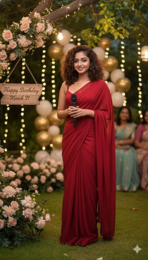 ultra-realistic, cinematic, print-ready. Elegant outdoor birthday party background with warm fairy lights, balloons, floral accents, soft bokeh, and a few blurred guests listening. Left end: asymmetric wooden hanging sign on an antique-gold chain from a tree, engraved “Happy Birthday, March 21”, softly lit with realistic shadows. Hero: woman standing slightly sideways on lush ground, holding a mic with both hands, gentle head tilt, relaxed stance, soft cheerful smile. Outfit: flowing long red saree. Lighting: soft ambient outdoor light, warm highlights. Face exactly identical to the uploaded reference image. Luxury, cinematic birthday vibe.