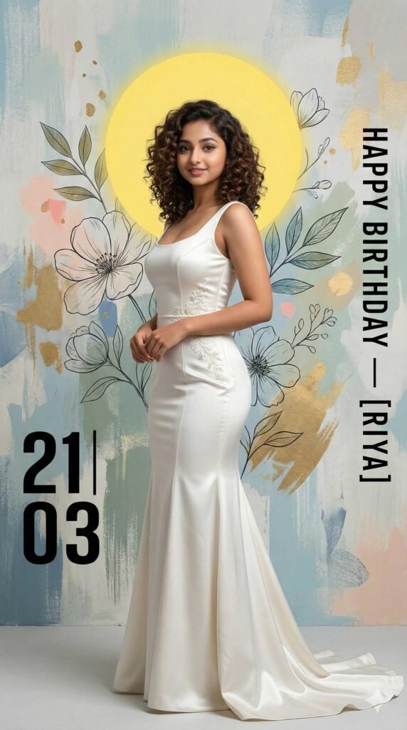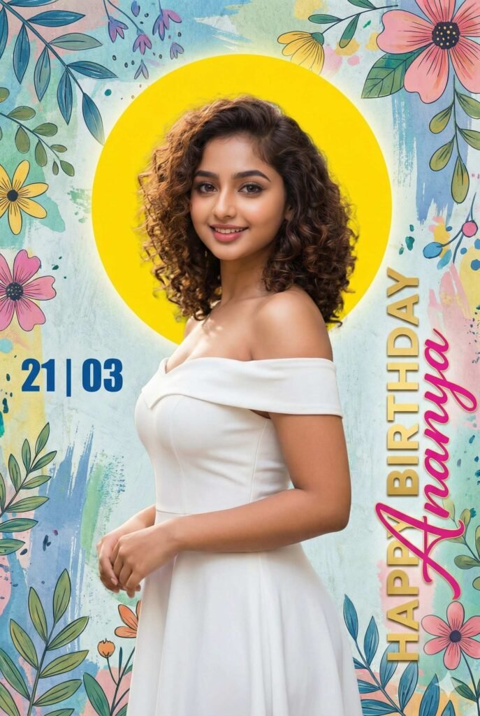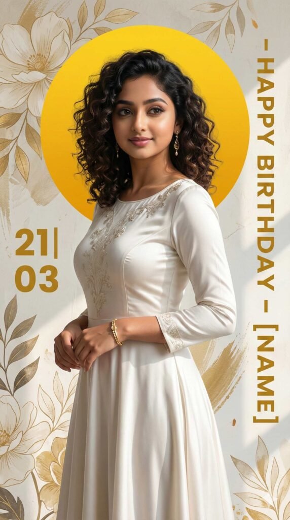 Ultra-realistic birthday poster of a young woman wearing an elegant white dress, standing slightly sideways and smiling naturally. Soft natural lighting on her face. Background features a textured artistic wall with floral illustrations, leaves, and paint-brush patterns. A large bright yellow circular halo behind the subject for contrast. Stylish vertical text on the right saying ‘HAPPY BIRTHDAY (your name)’. Bold date text ‘ 21 | 03’ on the left. Overall design modern, colorful, clean, and premium.
