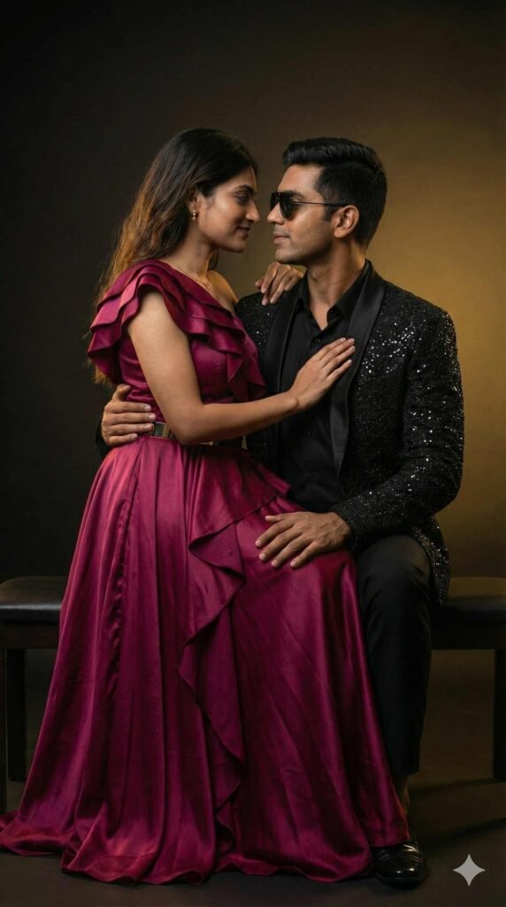 This image prompt is based on creating ultra-realistic, high-fashion celebrity couple portraits in a controlled studio environment. The theme focuses on luxury, romance, and power-couple energy, similar to premium fashion editorials, red-carpet campaigns, and magazine cover shoots. The minimalist dark background with a subtle gold gradient keeps the attention on facial expressions, body language, and expensive couture styling. The prompt emphasizes exact facial identity, natural skin texture, realistic fabric shine, and intimate yet elegant poses. Instead of decorations or props, the visual strength comes from lighting, pose chemistry, and a clean editorial composition that feels timeless, cinematic, and extremely premium.